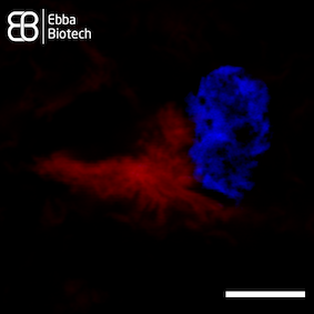 Superresolution images of thalamic tissue sections with pronounced PD pathology labeled with Amytracker 680 and DAPI counterstain show intracellular aggregates (red) located close to the nucleus (blue) in great detail (see image, scale bar 5 µm).