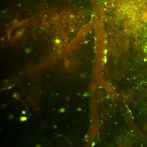 2-Photon microscopy of AmyTracker-520 labelling in 6-month-old 5XFAD mouse brain. Labelling is present in parenchymal plaques and cerebral amyloid angiopathy. Orange = blood vessels labelled with IV dextran, green = AmyTracker-520. Image was kindly provided from Leon Smyth, PhD, Washington School of Medicine in St. Louis, USA