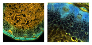 Optotracing in biorefinement of Canola Straw. Thin sections of canola straw were prepared for non-destructive optotracing analysis by fluorescence microscopy. Optotracing shows cellulose yellow and lignin blue-turquoise. The images were kindly provided by Prof. Ulrica Edlund.