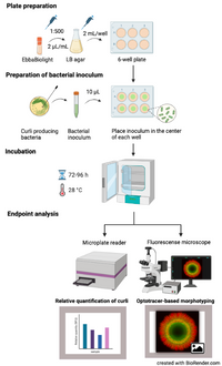 - Analyse in fluorescent microscope for optotracer based morphotyping OR in Fluorescence Microplate Reader for curli quantification.