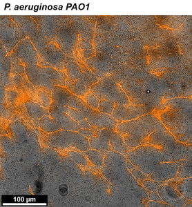 Pseudomonas aeruginosa (PAO1) grown in a microfluidic chamber with M9 medium for several days, labeled with EbbaBiolight 680. Red fluorescence channel was overlayed with bright field at 40X magnification. Image kindly provided from Hervé Straub, PhD student at Empa - Swiss Federal Laboratories for Materials Science and and Technology, St. Gallen, Switzerland